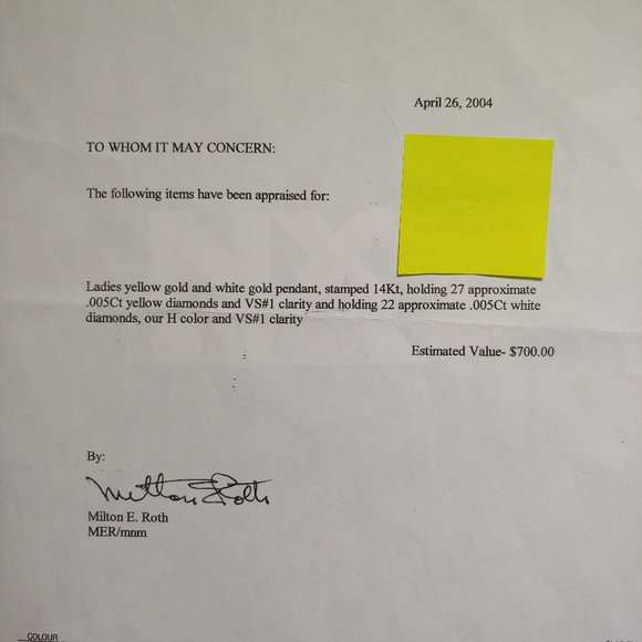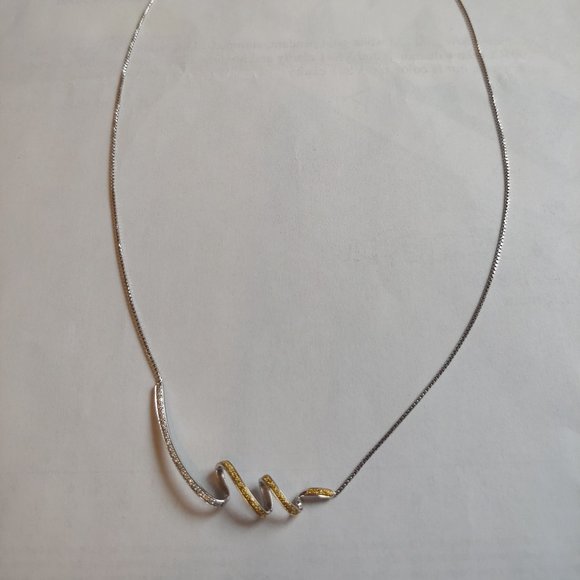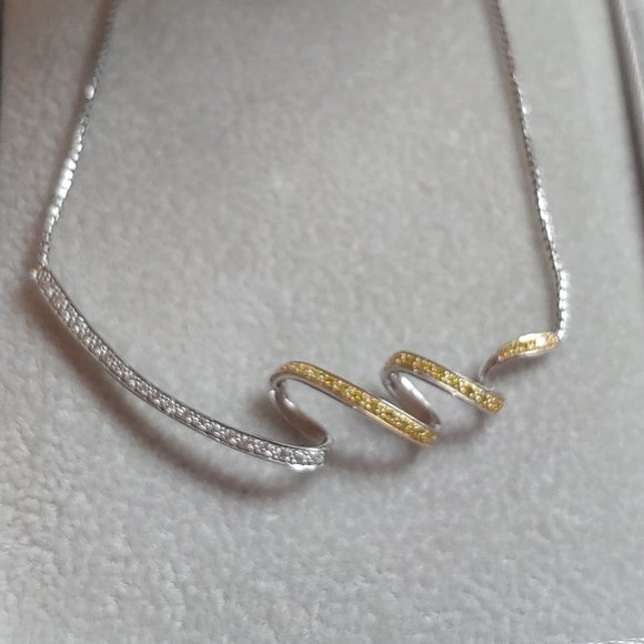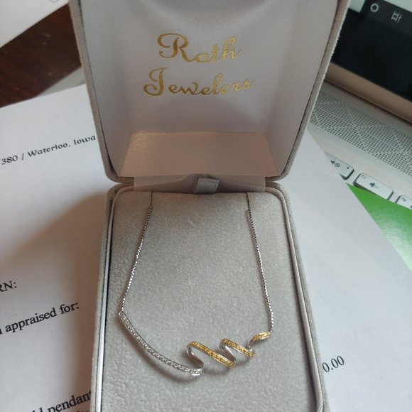 14K Yellow & White Gold Necklace with artistic swirl pendant w/ 27 diamonds .005Ct yellow diamonds and VS#1 clarity and holding 22 approximate .005Ct white diamond, our H color and VS#1 clarityChain is 14" in length Appraisal certificate from when it was purchased in 2004 for $700It is a beautiful necklace.It is all one piece.