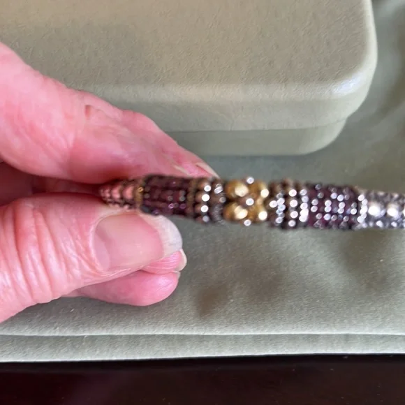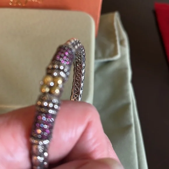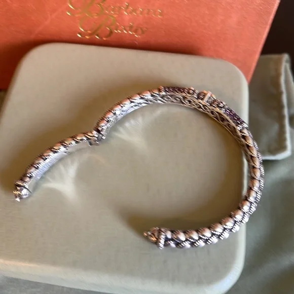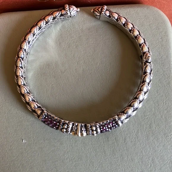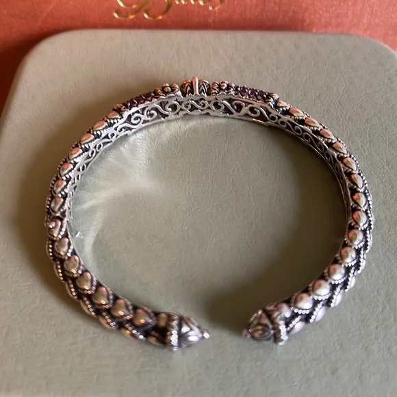 This is by designer Barbara Bixby. The lotus is considered one of the most important symbols in Eastern art because it represents spiritual enlightenment. 18k gold flower and sterling silver carving inspired by the lotus petal. Round Brazilian garnets which is approximately 1.25 carats. Black rhodium plated brings encase the garnet. Brushed sterling silver lotus design through out. Hinge opening. Fits average wrist. Approximately 1/4 in wide.