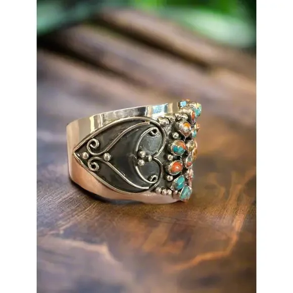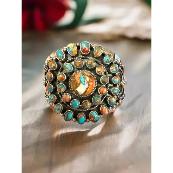 HUGE!!! Spiny Oyster Southwestern Cuff Bracelet Size 8+This gorgeous bracelet is made for larger wrists size 8 or larger as it’s easily adjustable. Eye catching at 2” wide & boasts beautiful quality stones. Solid 925 sterling silver backing & hallmarked 925.C1641777