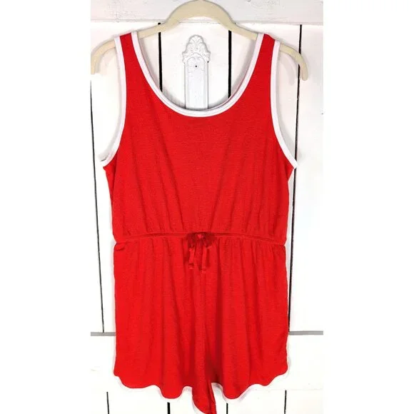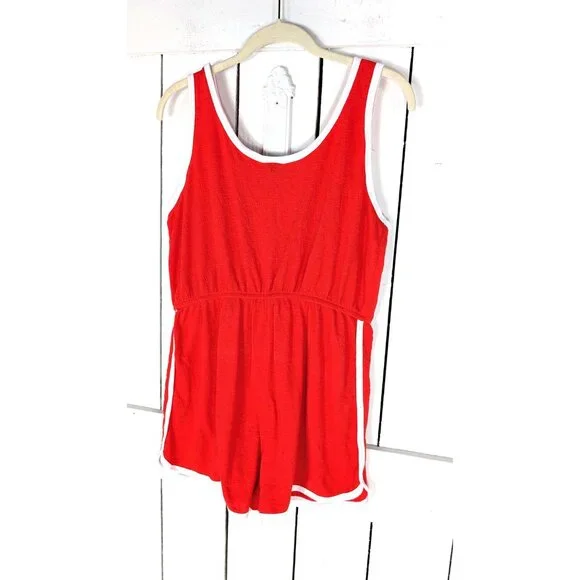 90s vintage red white sleeveless shorts romper Measurements…taken flat-marked size: juniors XL-pit to pit: 18"-across waist: 14"-across hip: 20"-length: 26"Features…-red with white trim-nice stretch-stretchy waist tie-soft and comfy-pull on shorts romperCondition…-excellent vintage condition-gently wornAA