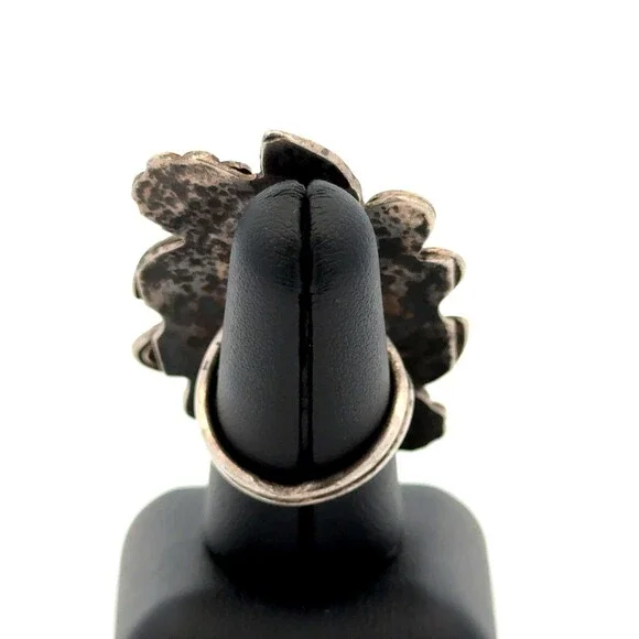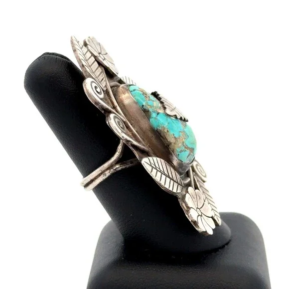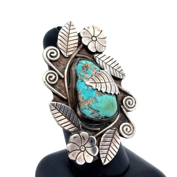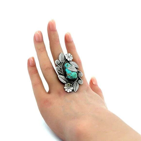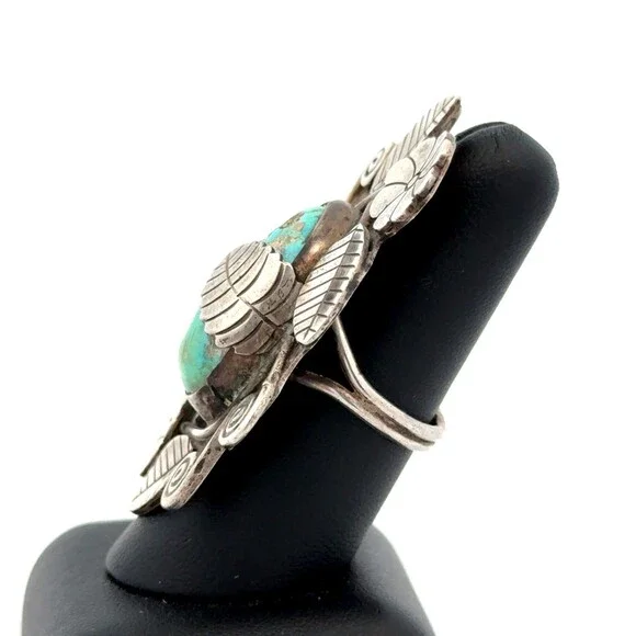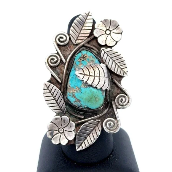 Estate 925 Sterling Silver Freeform Turquoise Nature Floral Leaf Statement Ring
