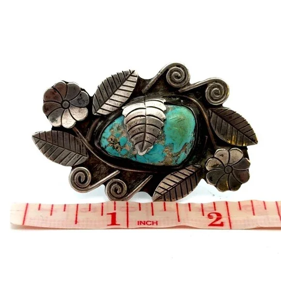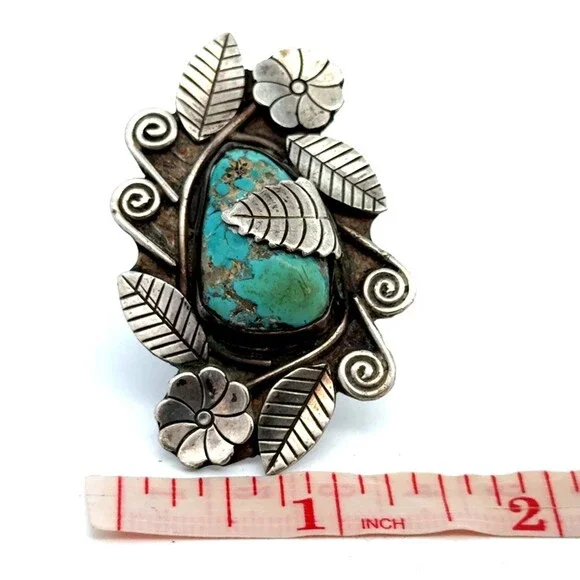* Estate 925 Sterling Silver Freeform Turquoise Nature Floral Leaf Statement Ring* Ring size: 7.25* Top of ring measures: 2-1/4" x 1-1/2"* Height: 3/8"* Band width: 3 mm* 1...
