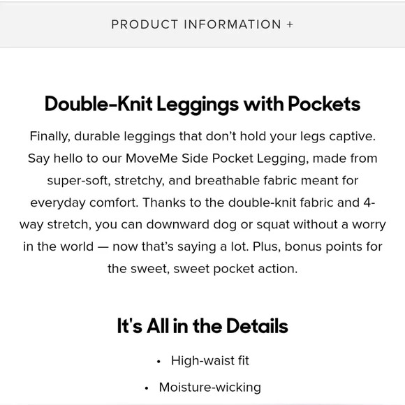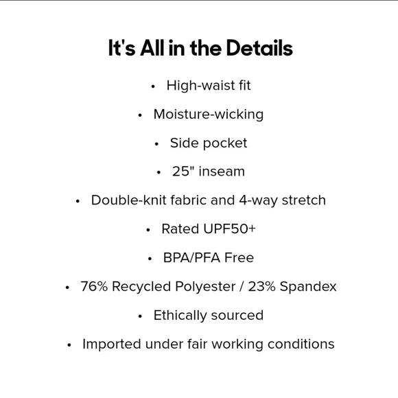 - New with Tags (NWT)- MeUndies- MoveMe Side Pocket Legging- Listing is for both size L & XL- Double-Knit Leggings with Pockets- High-waist fit- Moisture-wicking- Side pocket- 25" inseam- Double-knit fabric and 4-way stretch- Rated UPF50+- BPA/PFA Free- 76% Recycled Polyester / 23% Spandex- Ethically sourced- Imported under fair working conditions-From MeUndies:Finally, durable leggings that don’t hold your legs captive. Say hello to our MoveMe Side Pocket Legging, made from super-soft, stretchy, and breathable fabric meant for everyday comfort. Thanks to the double-knit fabric and 4-way stretch, you can downward dog or squat without a worry in the world — now that’s saying a lot. Plus, bonus points for the sweet, sweet pocket action.