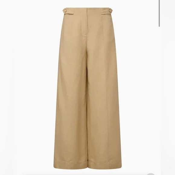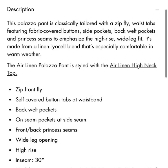 Brand new.This palazzo pant is classically tailored with a zip fly, waist tabs featuring fabric-covered buttons, side pockets, back welt pockets and princess seams to emphasize the high-rise, wide-leg fit. It’s made from a linen-Lyocell blend that’s especially comfortable in warm weather. The Air Linen Palazzo Pant is styled with the Air Linen High Neck Top (available in a separate listing).Zip front flySelf covered button tabs at waistbandBack welt pocketsOn seam pockets at side seamFront/back princess seamsWide leg openingHigh riseInseam: 30″