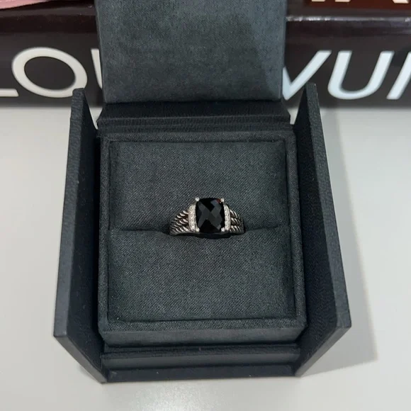 Sterling Silver with Black Onyx and Diamonds, 10mm. Size 7. This elegant ring features a stunning black stone set in a sleek silver band. Perfect for adding a touch of sophistication to any outfit. Comes with box.