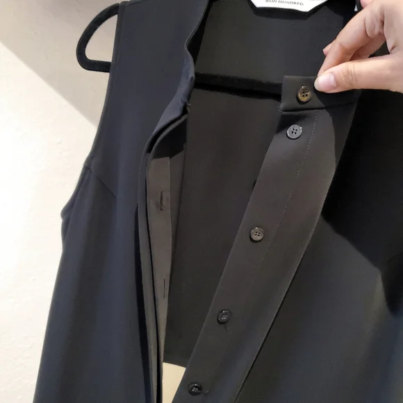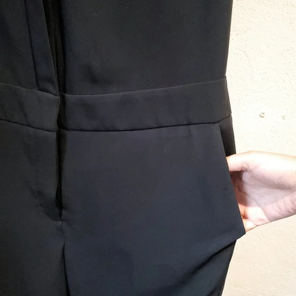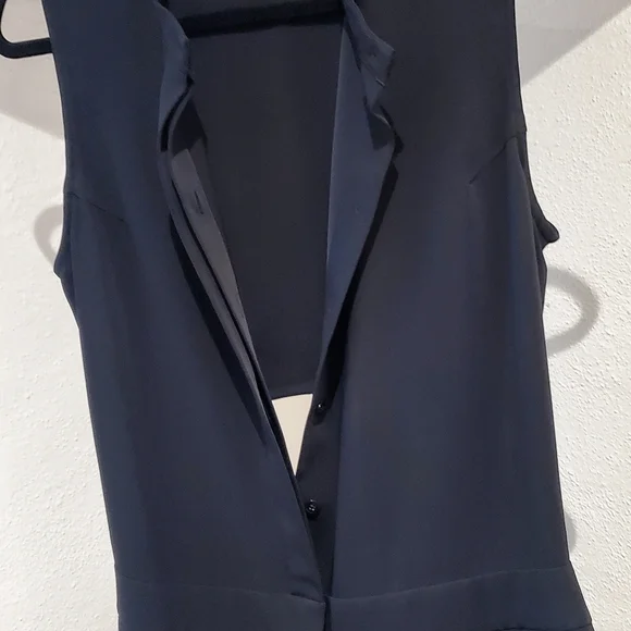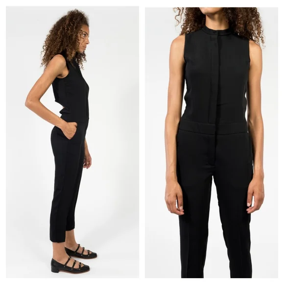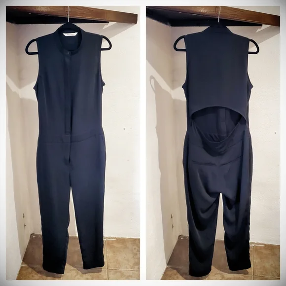 Tailored jumpsuitSleevelessButton closure with placketHigh necklineCut out detail at backPockets at hipsTapered legSize EU40 which according to their size chart is a US 8Pre-Owned, in excellent used conditions.No flawsMade in Lithuania. 100% Polyester. Machine wash cold, hang to dry.Approx Measurements (laying flat)Pit to pit 19.5"Waist 17"Rise 11"Inseam 27"Pants Length 38"Overall Length 57"B4B6