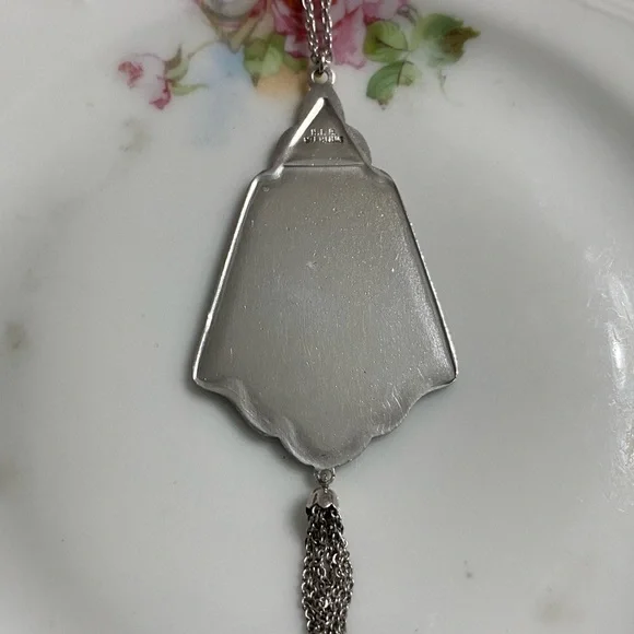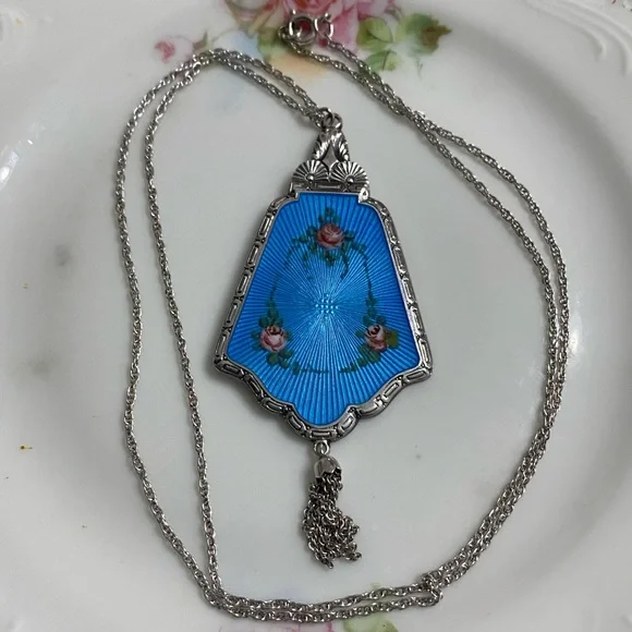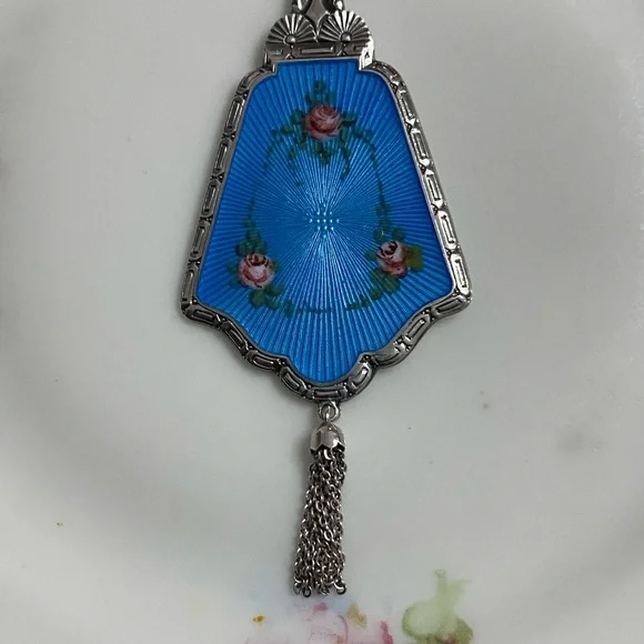This is a beautiful blue Guilloche Pendant with 3 pink roses and greenery!It has a Sterling tassel on the end and hangs from a 22” sterling chain.Harry Francis Barrows started his jewelry in 1853!Lovely Condition!Weighs 14.35 grams
