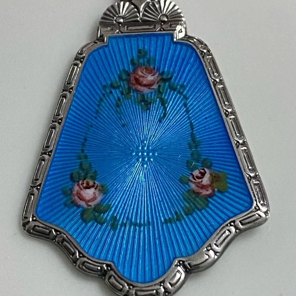 This is a beautiful blue Guilloche Pendant with 3 pink roses and greenery!It has a Sterling tassel on the end and hangs from a 22” sterling chain.Harry Francis Barrows started...