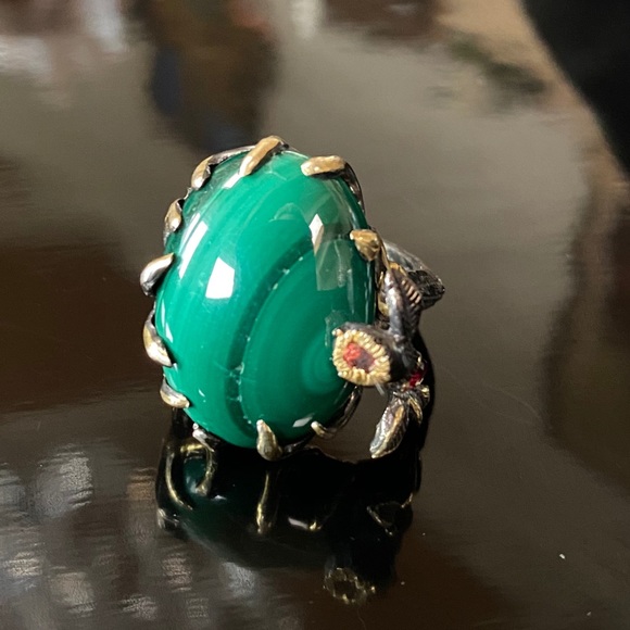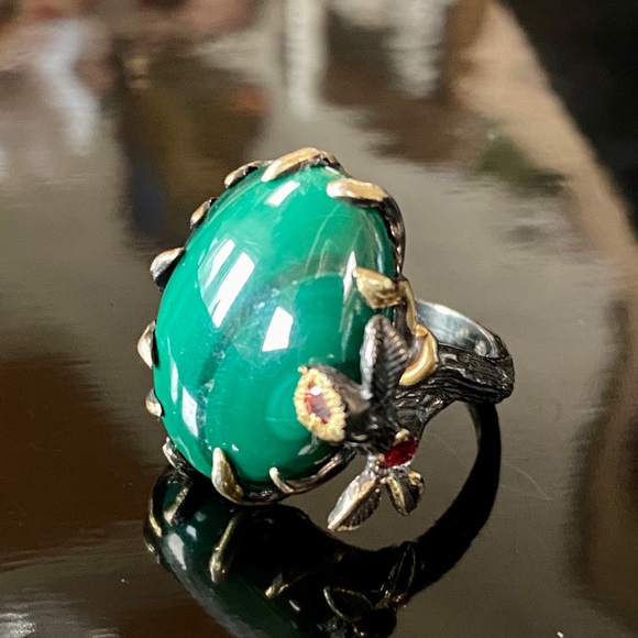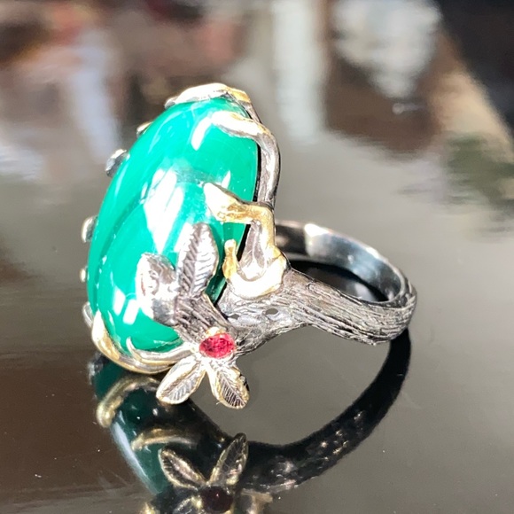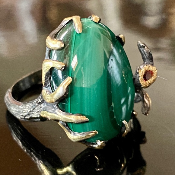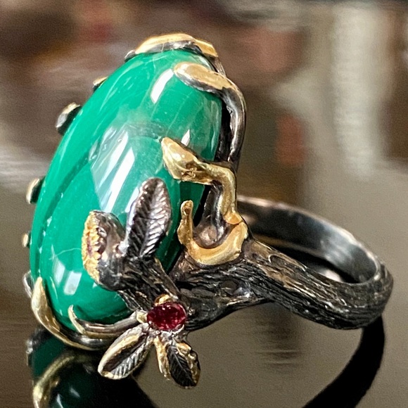 This one is a true treasure, one of a kind artistic creation with genuine high quality Malachite from Africa, it is over 21 CT!!!!925 sterling silver ring, overlaid with back rhodium and 14 K yellow gold, accented with genuine Rhodolite Garnet!Simply amazing timeless treasure!