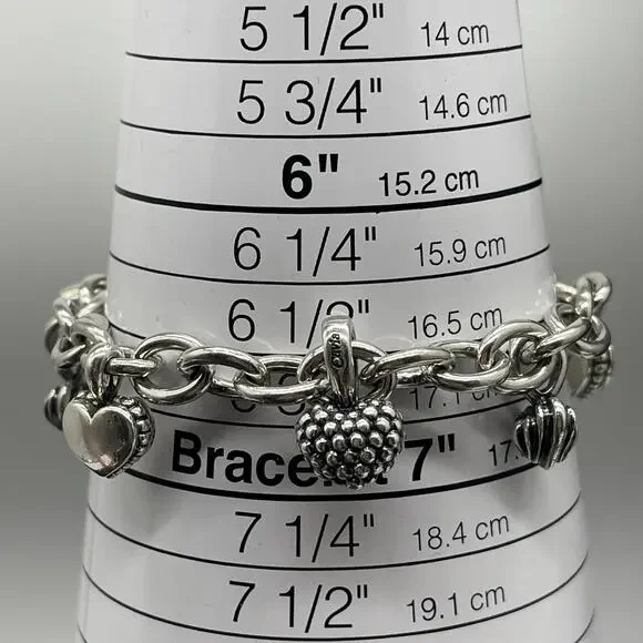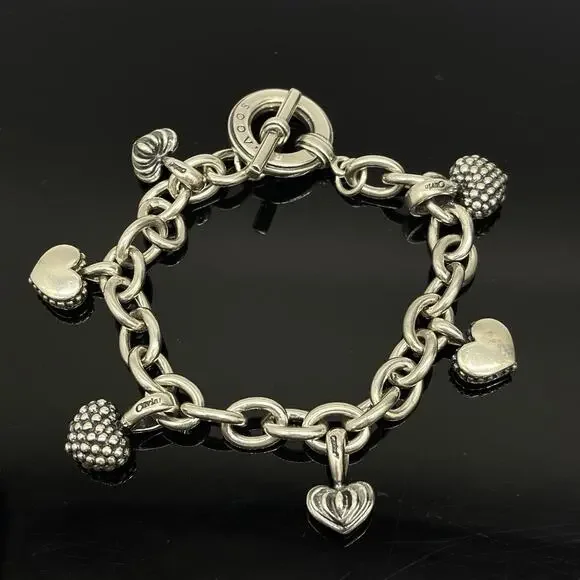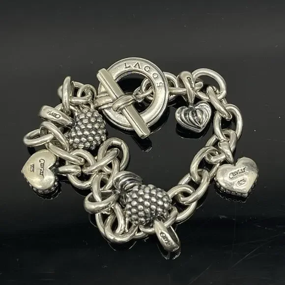 LAGOS Caviar Sterling Silver 6 Heart Charms Chain Link Toggle BraceletMeasures 6.5 inches longWeighs 48.56 gramsIn good preowned condition, does not come with its box or pouch