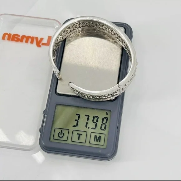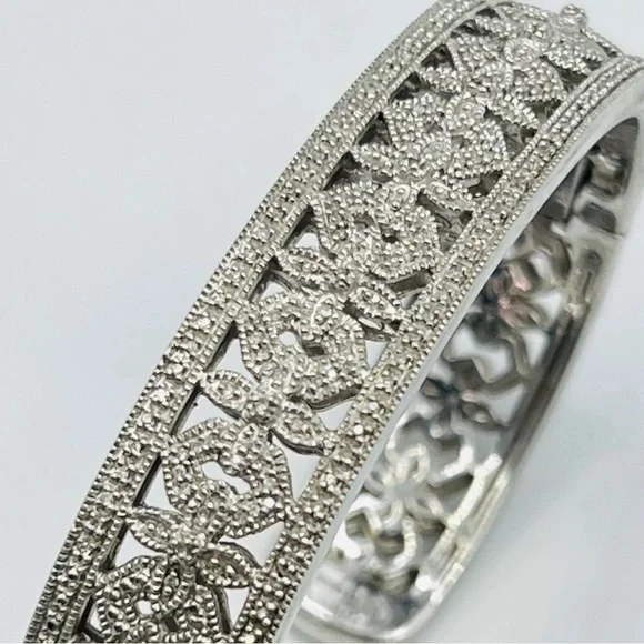 Nicely done sterling silver cuff bracelet. It is set with at least a couple hundred small single cut diamonds. The piece was quite expensive when 1st purchased. It is a size 7. Please see the pictures for measurements and weight.