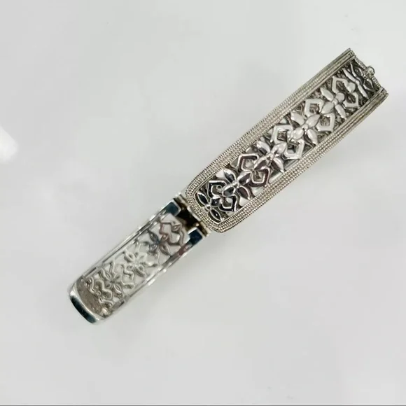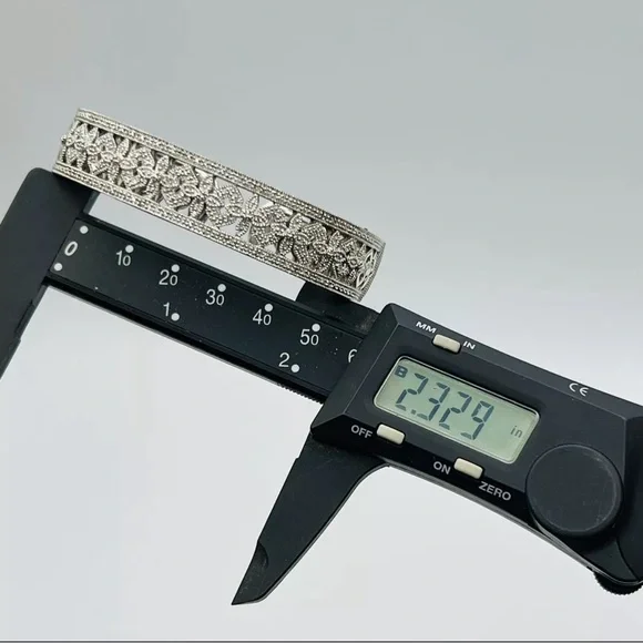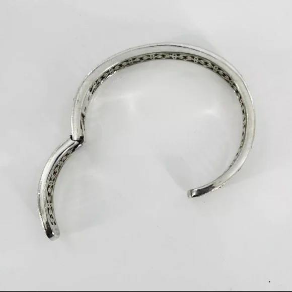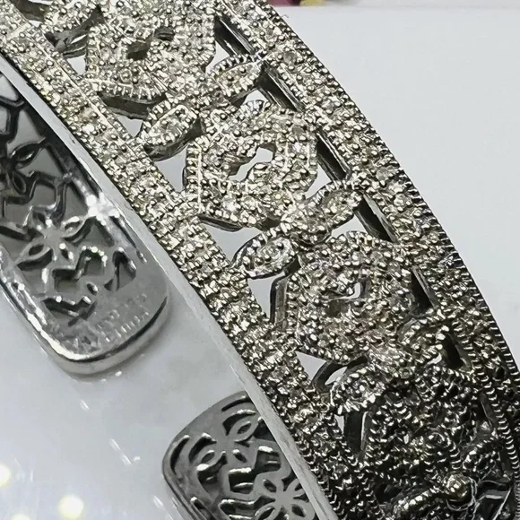 Nicely done sterling silver cuff bracelet. It is set with at least a couple hundred small single cut diamonds. The piece was quite expensive when 1st purchased. It is a size 7....