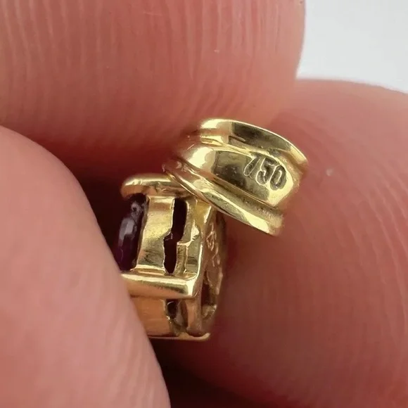 Up for consideration is a solid 18k gold natural ruby pendant. Ruby is eye clean and blood red. Absolutely beautiful and dainty, perfect for everyday wear. Purchased from eBay by a jeweler who sells estate jewelry and paid extra to have it sent to GIA to be authenticated. Designer 18K Yellow Gold Natural .62ctBurmese Ruby Dangle PendantSize: 1/2" Tall With bail by 5mm WideWeight is .8 Grams on my scaleMetal: 18k Yellow Gold - Hallmarked&Tested (appraised and authenticated) Natural Ruby Stone Size Are 4mm x 6mm(each)In Great Condition, Any Questions Please Feel Free to ask Thank you
