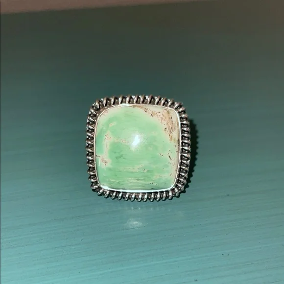 Goldie Lew Pandora Variscite RingSOLD OUTThe Variscite stone never fails to amaze us with its stunning green beauty!Sterling silverVariscite stoneThick rope like borderAdjustableSingle bandMeasures about 4 cm