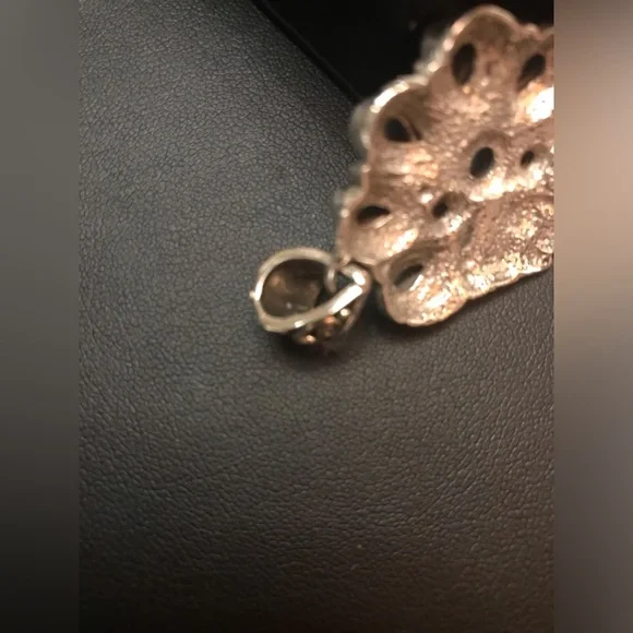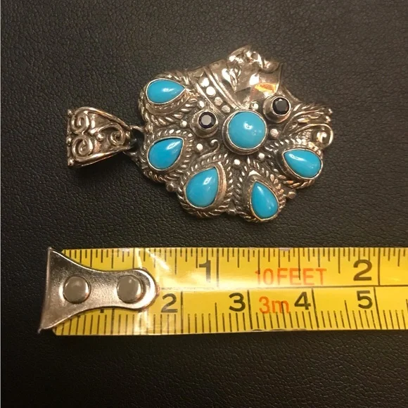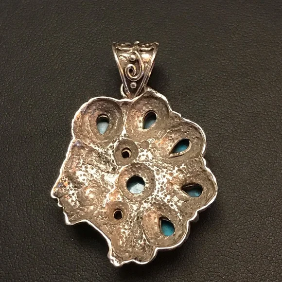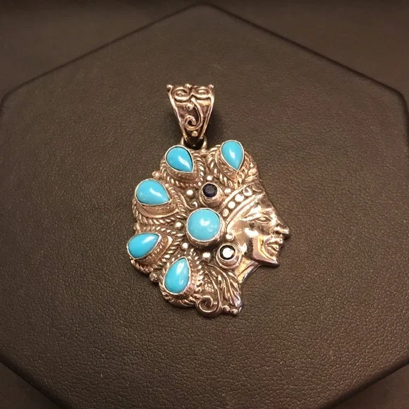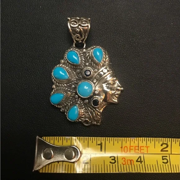 Sleeping Beauty Indian Chief Pendant Sterling Silver Turquoise Black sapphire Marked 925 In New, Excellent Condition!