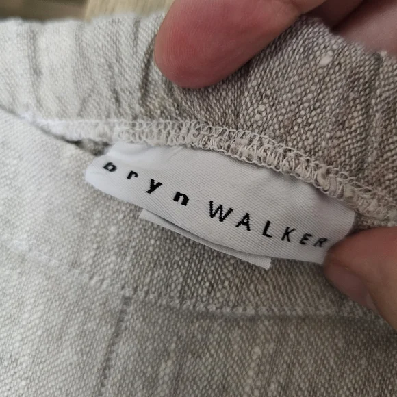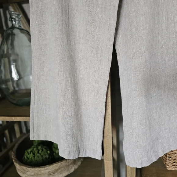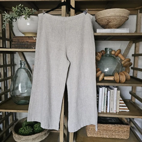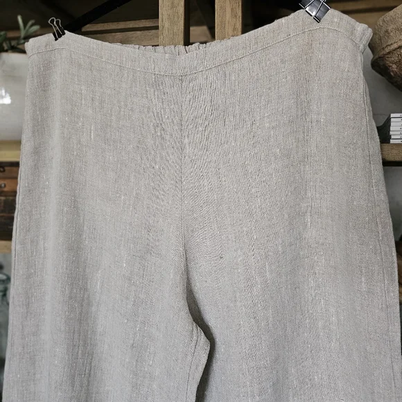 Bryn Walker Linen Wide Leg Pants Cream Tan Woven Lagenlook Coastal Boho Sz LDescription:Elevated and effortlessly cool, these wide-leg woven linen pants by Bryn Walker embody the relaxed sophistication of California coastal living. In a soft cream-tan hue and breathable 100% linen weave, these full-length trousers feature a flat front, pull-on waistband, and wide flowing silhouette that drapes beautifully with every step.Size Large100% LinenColor: Cream/TanWide leg, full lengthFlat frontPull-on styleApprox. 19” waist (laid flat)Excellent pre-owned condition — no flawsA versatile essential for the minimalist, lagenlook, or artsy dresser — perfect with oversized tops, layered knits, or simple tanks. These pants work beautifully year-round and look especially chic with leather sandals, espadrilles, or structured flats.