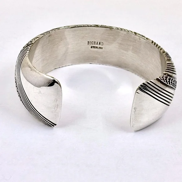 For your consideration is a vintage sterling cuff bracelet by the Navajo artist Albert Bighand. The cuff is in very good condition and is heavy at 44.25 grams. Approx. Sizes:...