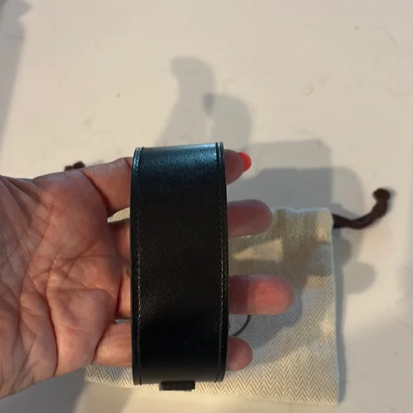 Elegant Hermes bracelet. Features black leather and silver hardware. Stylish and sophisticated.