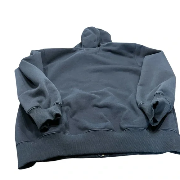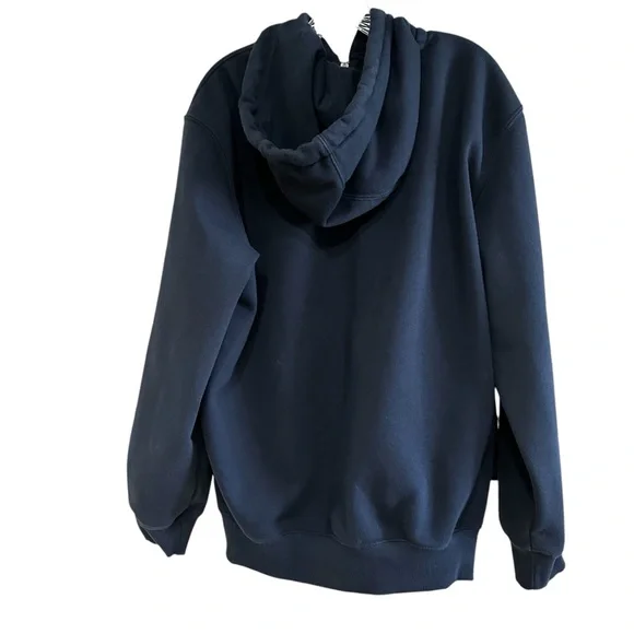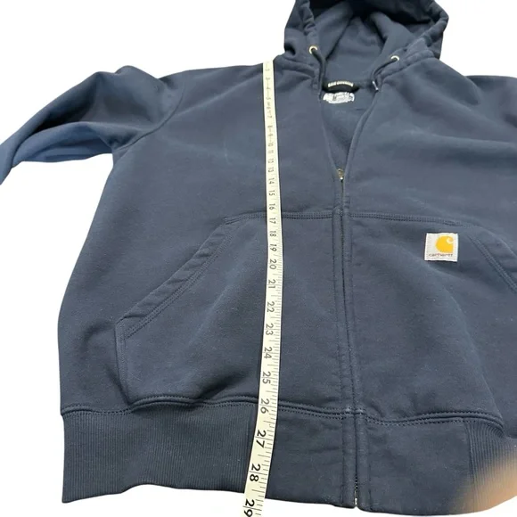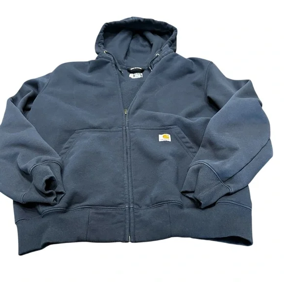 Stylish Carhartt navy blue hoodie. Features a full zip and front pockets. Perfect for casual wear.