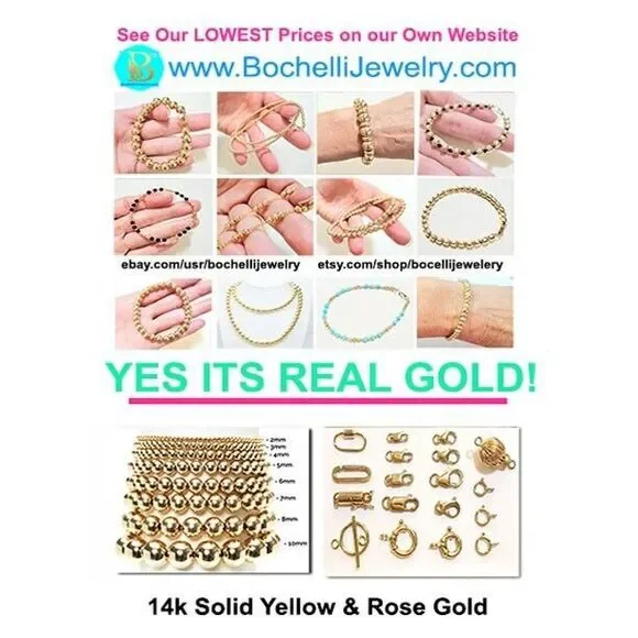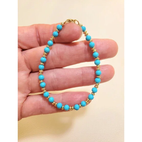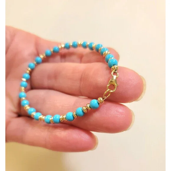 **GET LOWER PRICES ON OUR WEBSITE!! - BOCHELLIJEWELRY.COM - (not on here on our own website)***THIS IS A HANDMADE ITEM AND IS STAMPED 14K ON THE TONGUE PART OF THE CLASP - THE PART THAT OPENS***THIS LISTING IS FOR ONE SOLID 14K GOLD and TURQUOISE BEAD BRACELET WITH LOBSTER CLASPNatural Sky Blue Sleeping Beauty 4mm Beads14k Solid Yellow Gold 3mm Hammered Saucer Beads - Rose White Gold are NOT available. 14k Solid Yellow or Rose Gold 7mm Pear Shaped Lobster ClaspFlexible Non-Tarnish Steel WireMEASURE YOUR WRIST!!! Before Ordering and ADD 1/2" (for 4-6mm beads only). DO NOT MEASURE ANOTHER BRACELET. OUR LENGTHS INCLUDE THE CLASP AND END PARTS. You can wrap a piece of string around then measure the string.* BUYER PAYS RETURN SHIPPING so please take a second to Measure and Determine The Length you need, so you can order the right length. Our Lengths Include the Clasp/End Parts.• IMPORTANT: Measuring a bracelet made of different size beads than you are ordering from us will cause errors. Measure around Your Wrist then add 1/4".• We Photograph Items on a Ruler Before Shipping. If you believe we sent the wrong size, send us a photo of it on your ruler before opening a return stating its the wrong size.Note: Objects in Close Up Photos can Seem Bigger than they are. Compare measurements in the listing to Your Own Ruler before purchasing.** 3-12mm gold beads available. Hundreds of Styles! see our shopWHAT ITS STRUNG ON: IF IT SAYS CHA