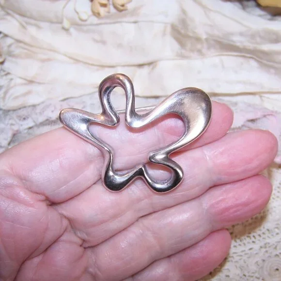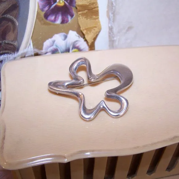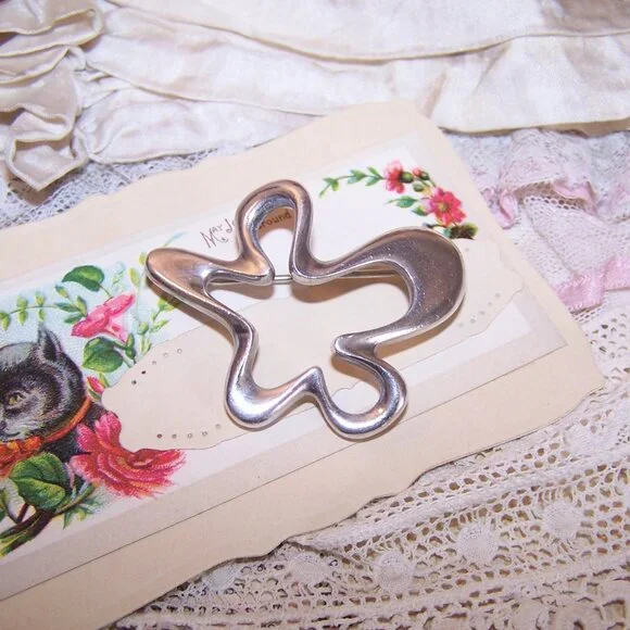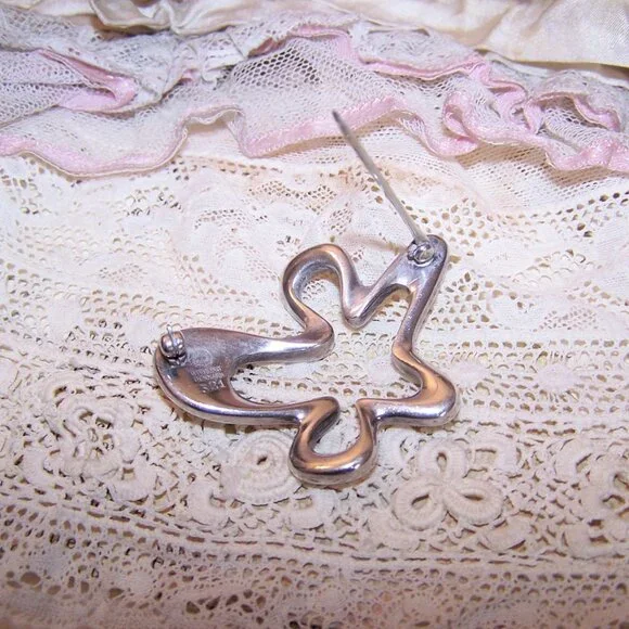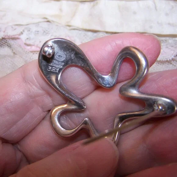 Dating to the 1950s/1960s or so, here´s a Henning Koppel designed for Sterling Silver (hallmarked as pictured) pin / brooch. Called SPLASH, the design number is 321. Size is 1-13/16" x 1-1/2"; weight is 17.8 grams. Safety catch to hold the pinstem in place. Excellent condition with no problems I can spot.Re - Georg Arthur Jensen (31 August 1866 in Rådvad – 2 October 1935 in Copenhagen) was a Danish silversmith and founder of A/S (also known as Sølvsmedie). Beginning with his artistic sojourn into ceramics, Jensen made his first piece of jewelry in 1899. In 1901, Jensen abandoned ceramics and reinvented himself as a silversmith designer with one of the most famous names of his day, Mogens Ballin. With the faith he had in his work he decided to risk the meager savings he had accumulated to open his own silver shop 36 Bredgade, Copenhagen. Jensen´s designs combined fine art with applied art and his early Art Nouveau designs were a triumph. His business grew quickly until he had retail shops in a New York, Berlin and London. His company is still in existence and to this day continues to produce finely wrought silver designs.(7685RV/BQV)