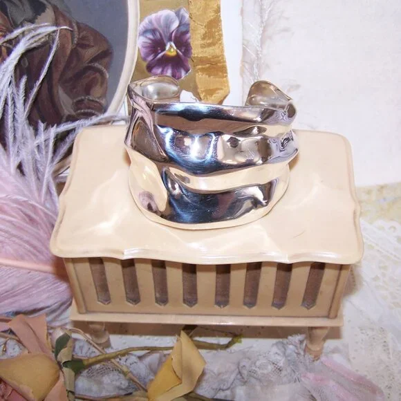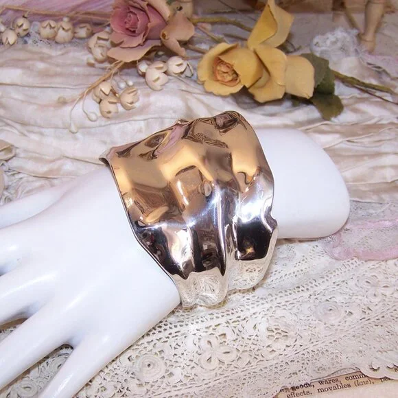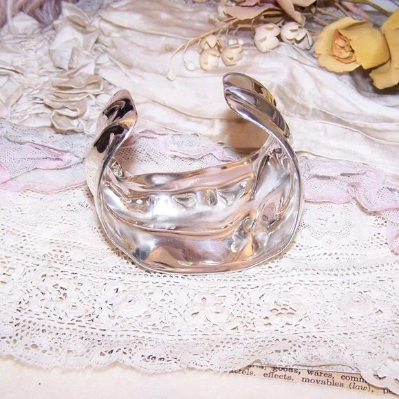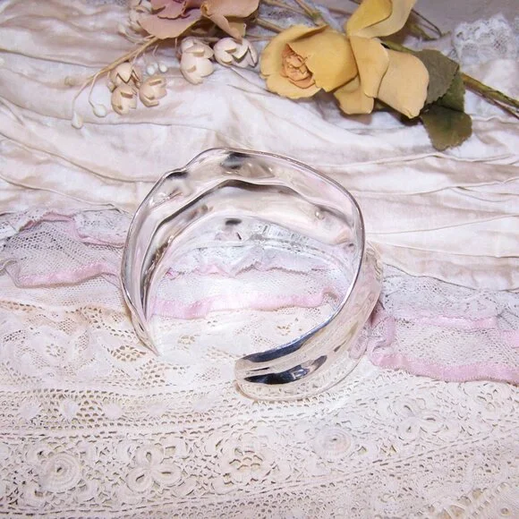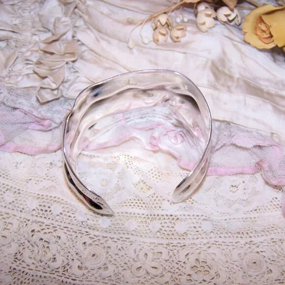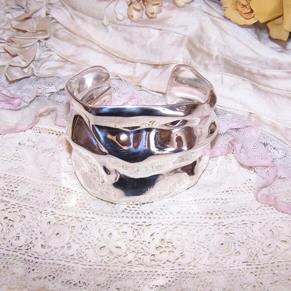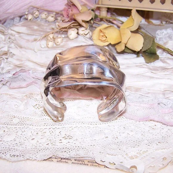Made in Mexico and dating to the 1980s or so, here´s a real statement piece of jewelry! Made of Sterling Silver (hallmarked as pictured), the wavy cuff bracelet takes its design from the Tiffany´s Italian designer Peretti. Width to the front is a little over 2"; width at the ends is 1-1/4". Inside length with a fabric tape measure is 6.25"; width left-to-right is 2-3/8" on the inside. Length on the outside with a fabric tape measure is 6-3/4". Weight is a hefty 72.1 grams - over 2 ounces of silver. The cuff is quite sturdy - not malleable at all. Smooth finish that feels very silky against the skin. I just wish I could have gotten it on my wrist but I can´t - the mannekin hand will have to show you just how gorgeous it is!(7687RV/BQV)