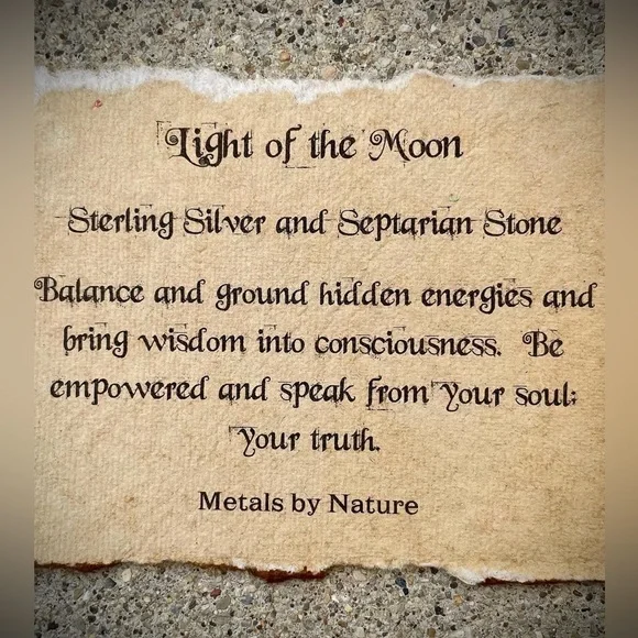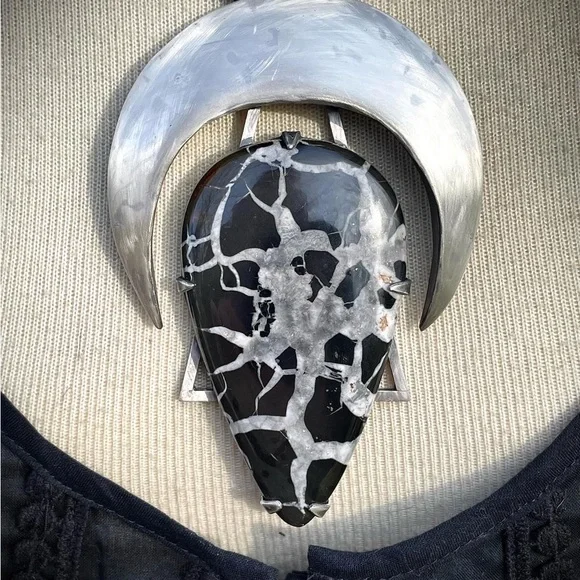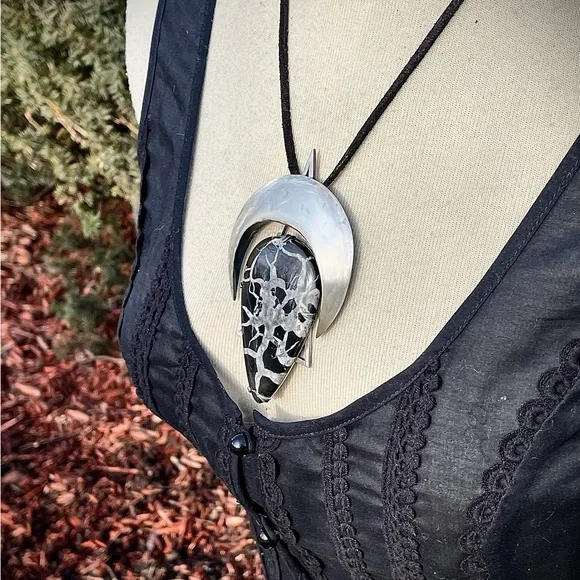 100% Hand made. Sterling silver, Septarian stone and Leather. 19.5" necklace Balance and ground hidden energies and bring wisdom into consciousness. Be empowered and speak from your soul; your truth.If you like the jewelry I create please consider purchasing at www.metalsbynature.comYou can also follow me on Instagram: https://instagram.com/metals_by_natureAnd FB:https://www.facebook.com/MetalsbyNature/