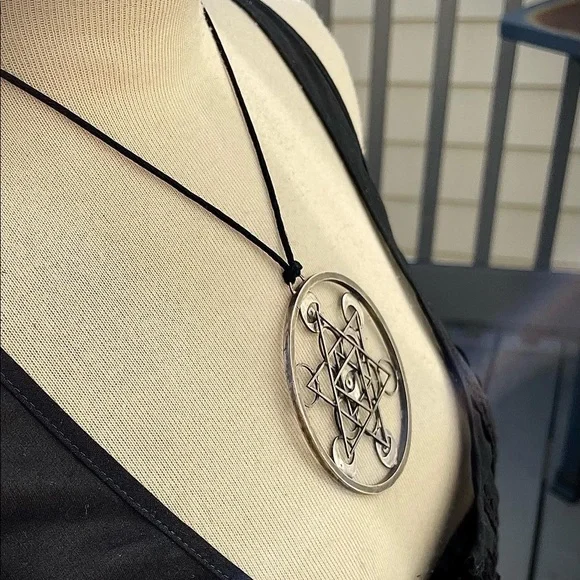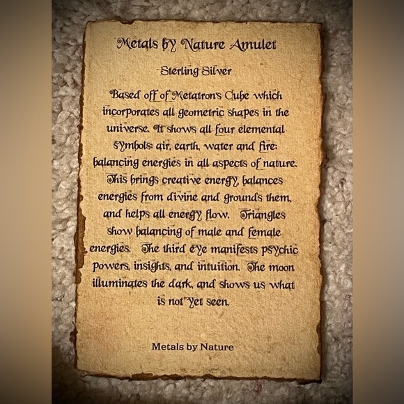 Metals by Nature is my brand.I create handmade one of a kind pieces.Pendant is 100% Hand made, Sterling Silver. 17" Black Rayon/Cotton Cord with sterling silver closure. Diameter of piece is 2 3/4" Based off of Metatron´s Cube which incorporates all geometric shapes in the universe. It shows all four elemental symbols; air, earth, water and fire; balancing energies in all aspects of nature. This brings creative energy, balances energies from divine and grounds them, and helps all energy flow. Triangles show balancing of male and female energies. The third eye manifests psychic powers, insights, and intuition. The moon illuminates the dark, and shows us what is not yet seen. You are protected.If you like the jewelry I create please consider purchasing at www.metalsbynature.comYou can also follow me on Instagram: https://instagram.com/metals_by_natureAnd FB:https://www.facebook.com/MetalsbyNature/